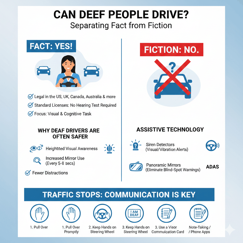 Yes, you can still drive safely even if you become deaf. There is no hearing requirement for a standard driver’s license. Deaf drivers rely more on visual cues and may use additional safety measures like special lights to alert them of sirens or horns.